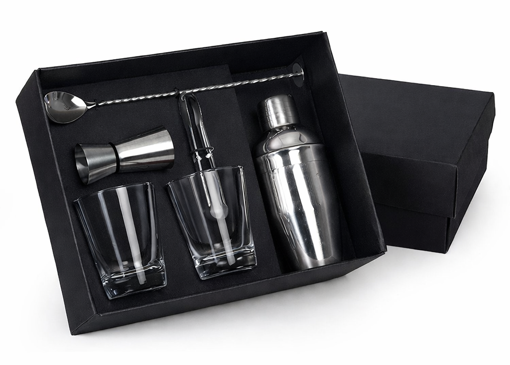 Kit em caixa de papel, coqueteleira de 500ml, colher, copo dosador, pegador de gelo e 2 copos de vidro de 220ml cada.