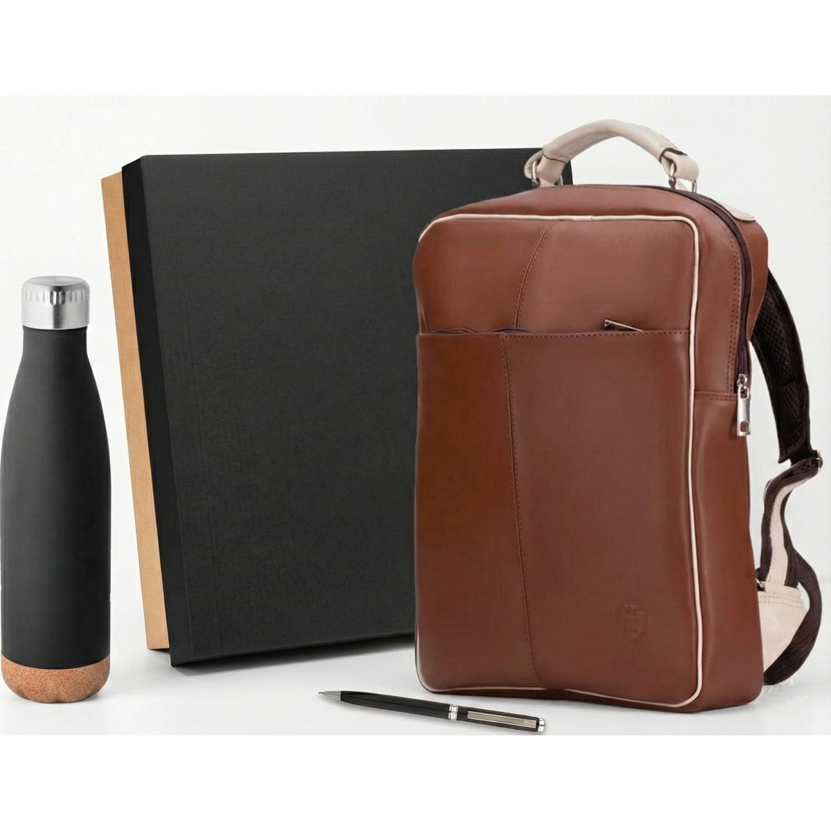 Kit em caixa de papel, , caneta de metal, garrafa térmica de 550ml, mochila de couro sintético premium com forração em 210, espumada e com acabamento premium.
