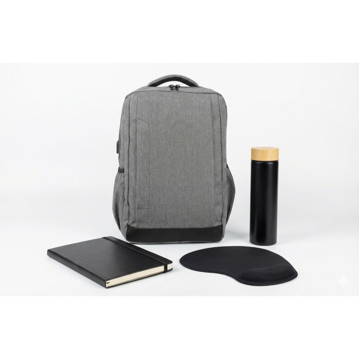 Kit com mochila de poliéster de alta densidade, mouse pad de Neoprene Caderno capa courino com 80 fls, garrafa termica de 450m