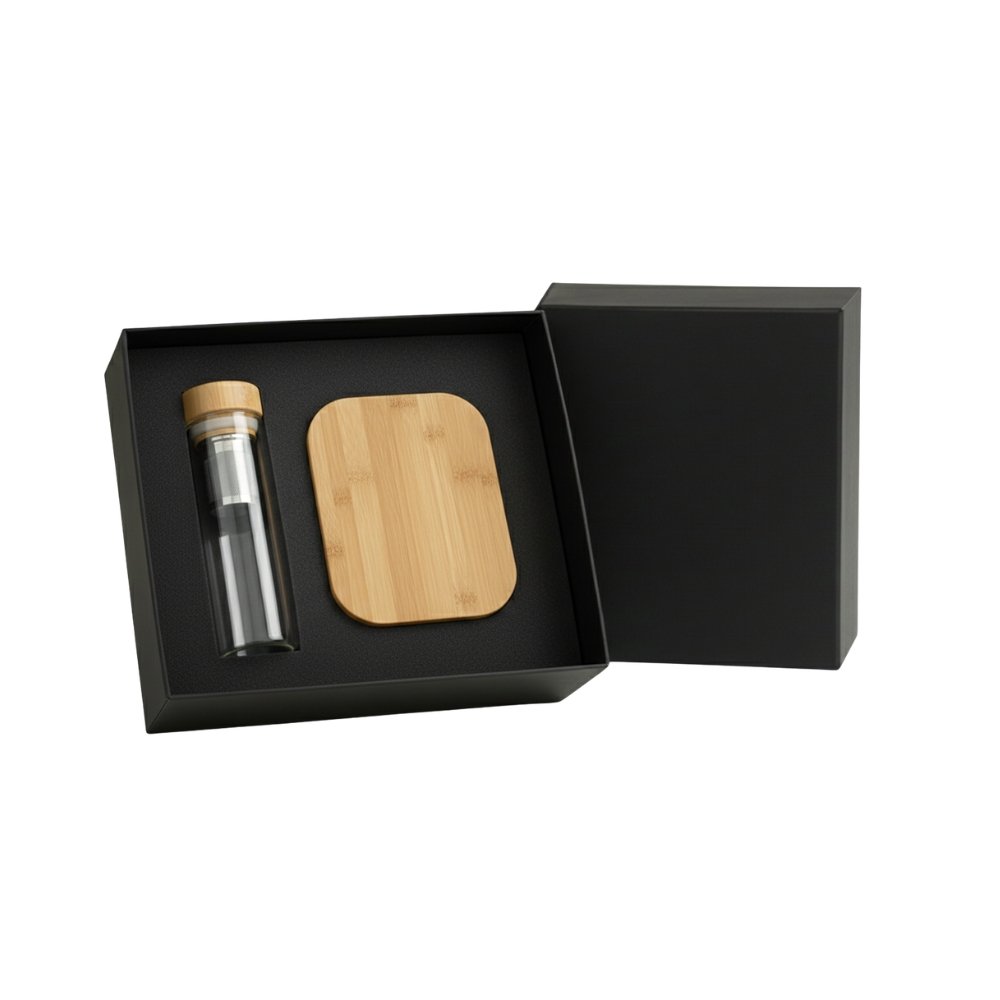 Kit em caixa de papel, garrafa de vidro com infusor para chá e carregador de celular ambos com acabamento de bambu.