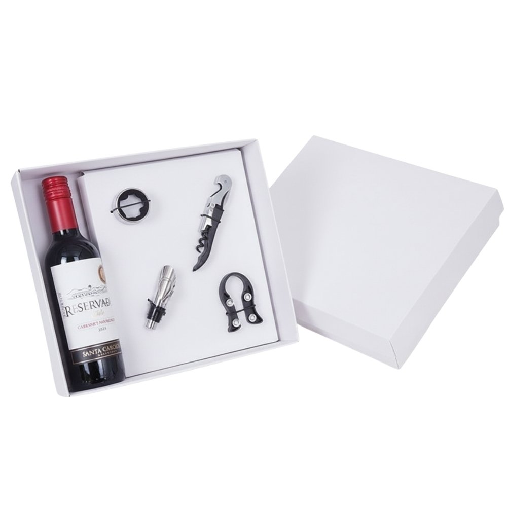 Kit em caixa de papel, vinho Chileno Santa Carolina Reservado de 375ml, salva gotas, corta lacre, abridor de vinho e bico direcionador.